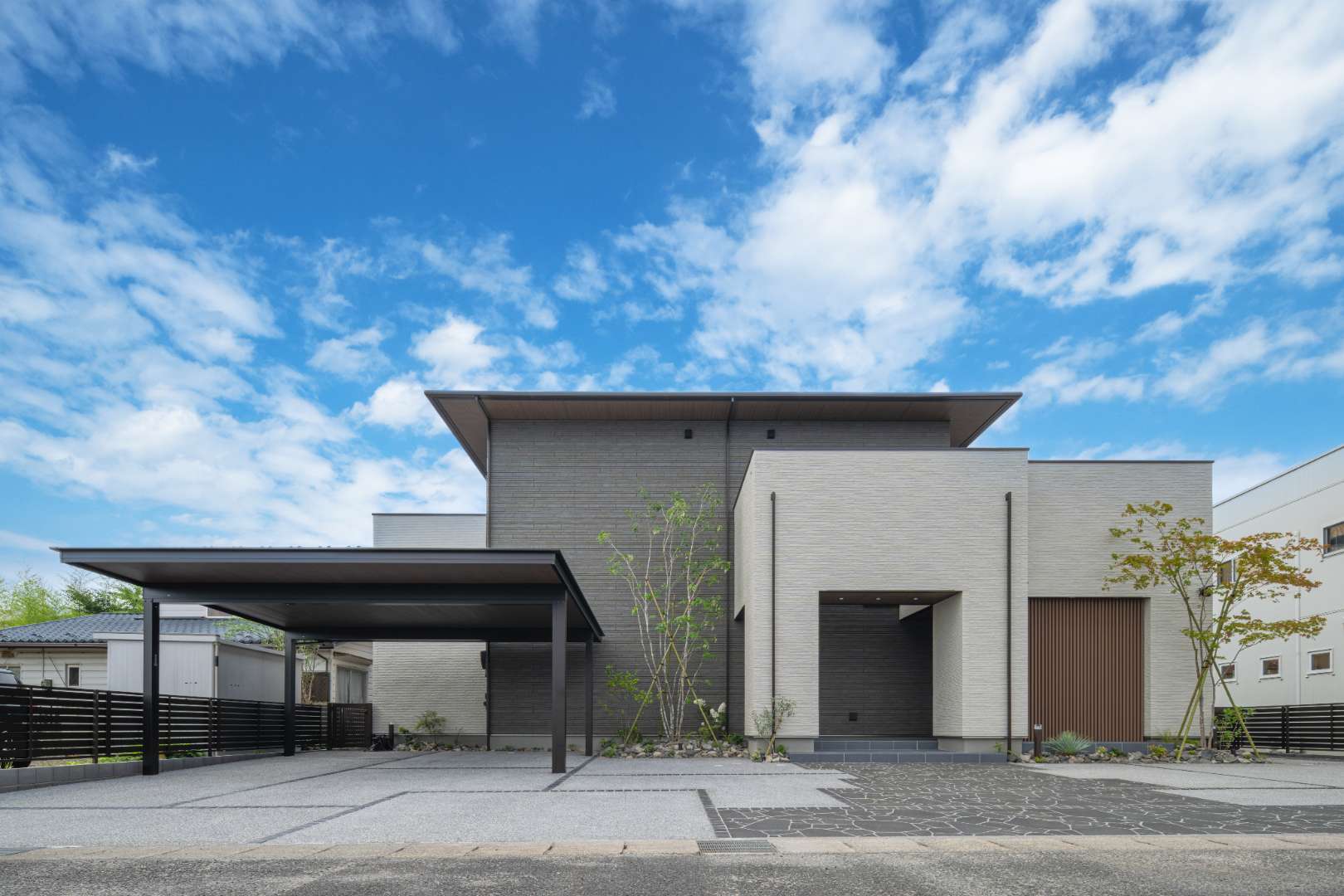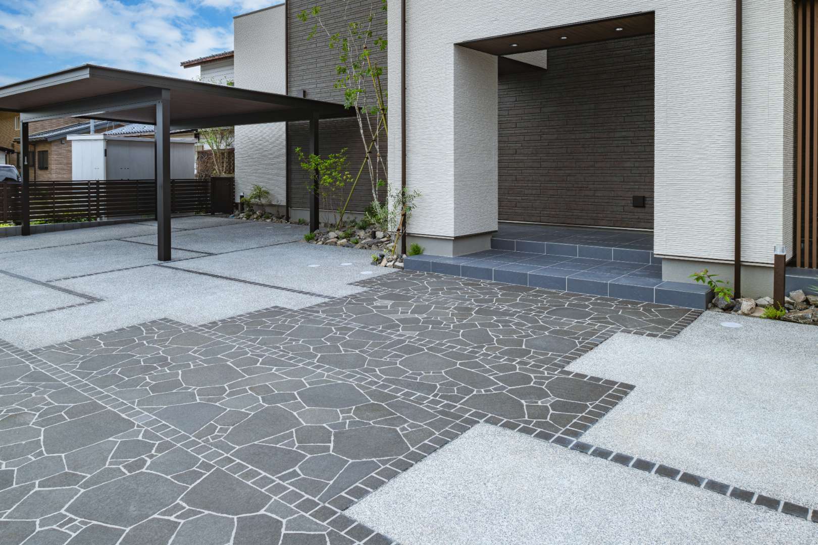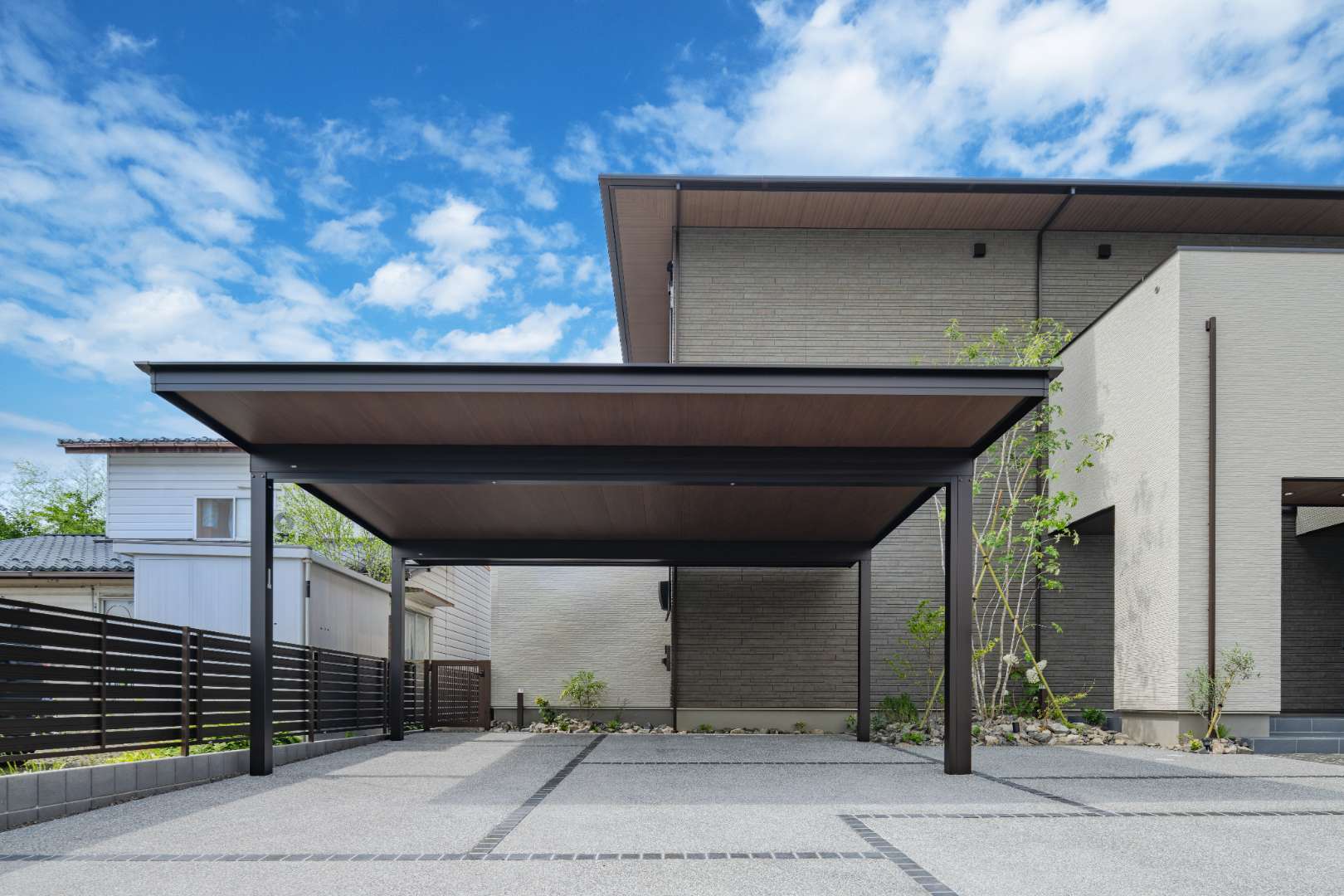 シャープな高意匠鼻隠しと木調の軒天張りを施したジーポートProで、建物外観と調和した上質なカースペースを演出。また舗装にはブラックが際立つ、重厚感のある天然石を使用。こだわったデザインで意匠性の高いアプローチに。