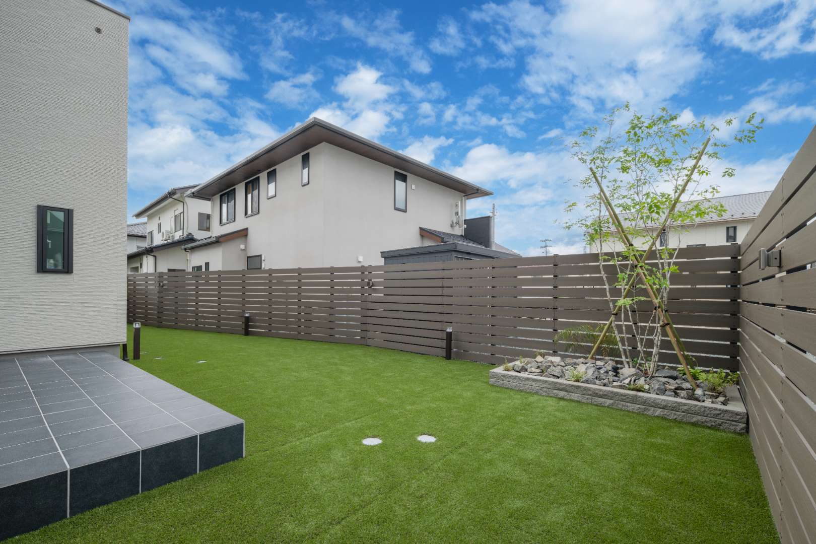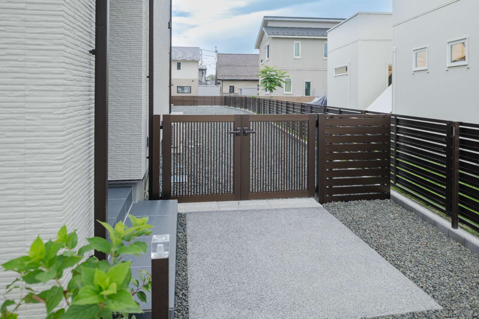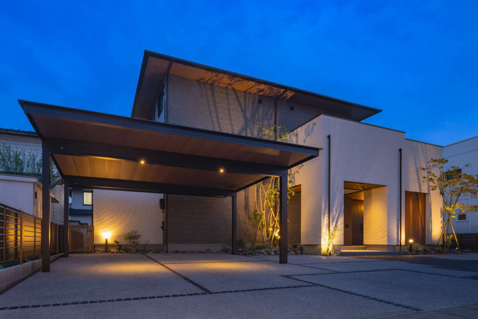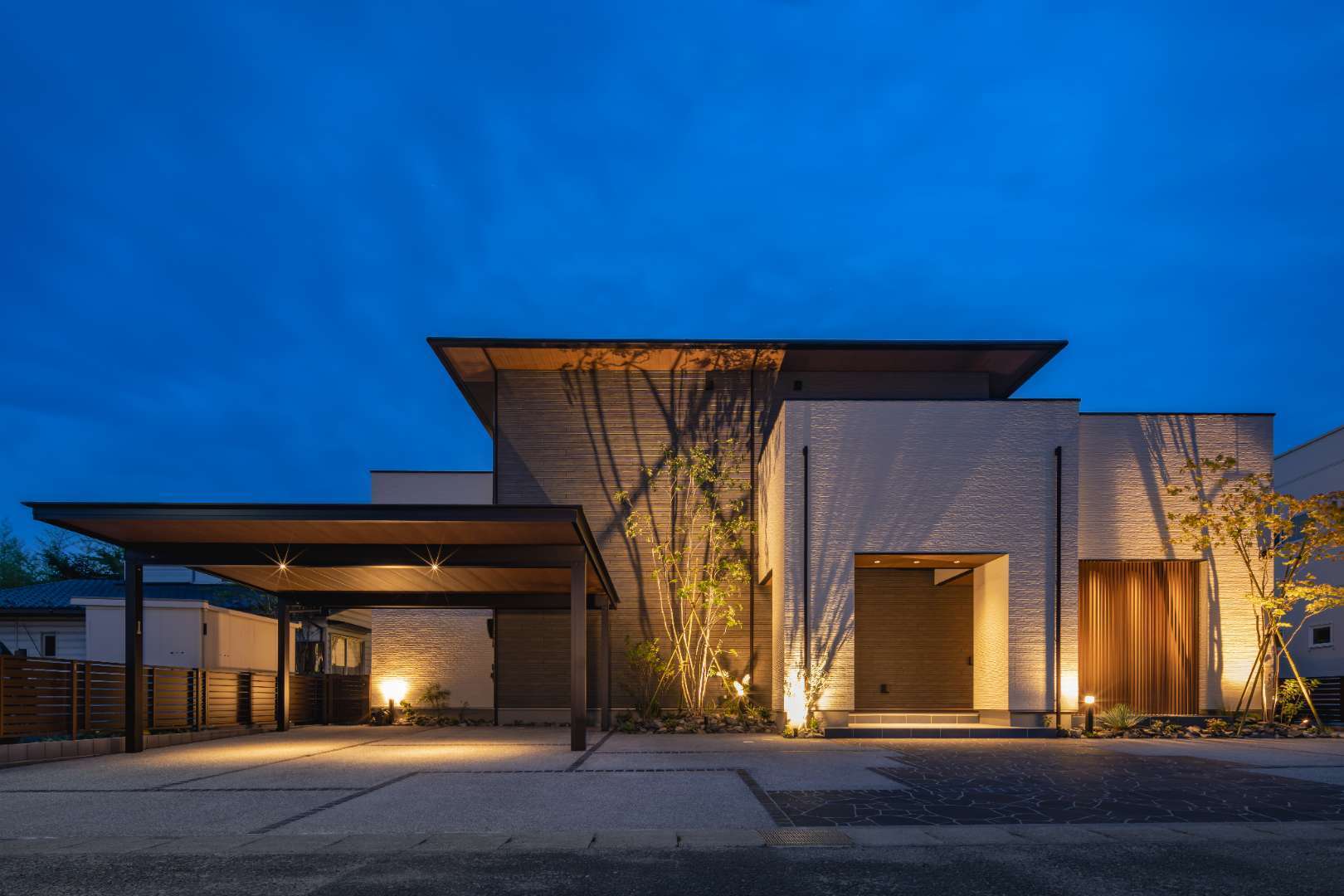 シャープな高意匠鼻隠しと木調の軒天張りを施したジーポートProで、建物外観と調和した上質なカースペースを演出。また舗装にはブラックが際立つ、重厚感のある天然石を使用。こだわったデザインで意匠性の高いアプローチに。