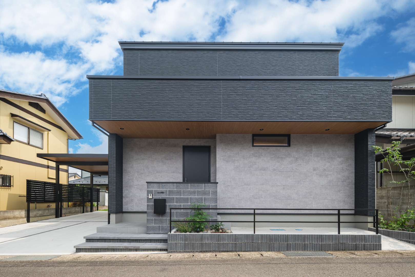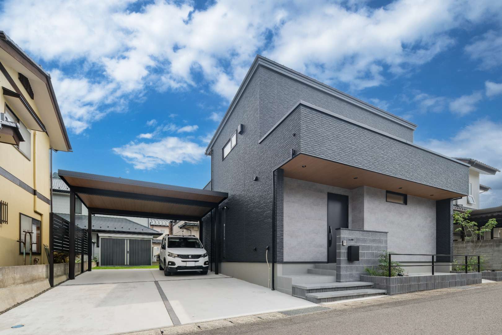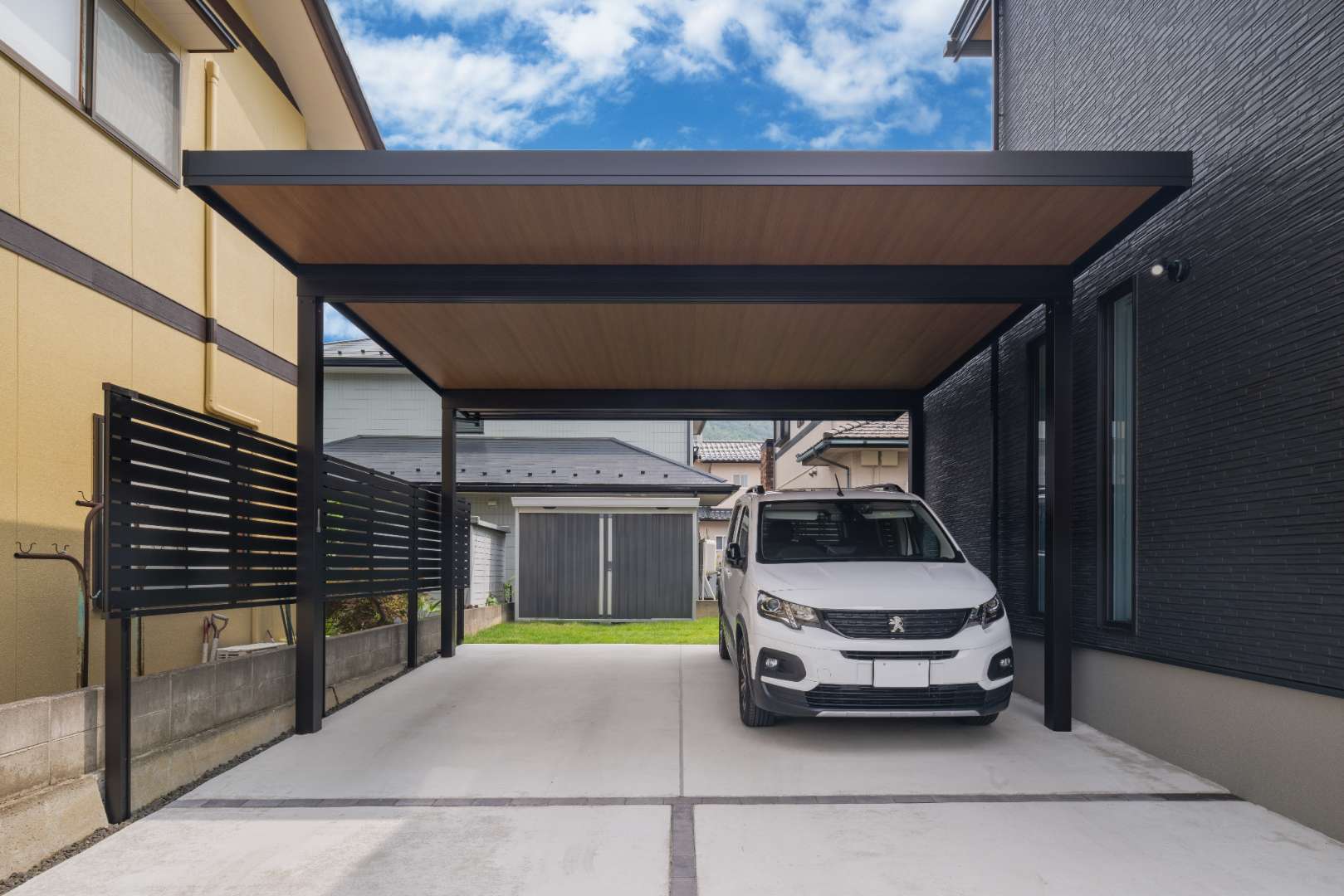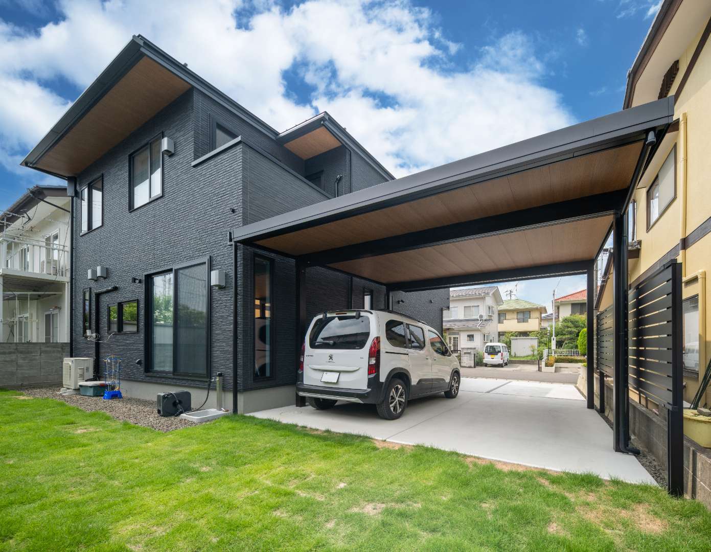 カースペースには外からの視線を遮りながら、落ち着いたプライバシー空間を演出するアルミフェンスを採用。木調の軒天を施したカーポートが建物外観と自然に馴染み、ナチュラルさの中に上質さを感じる仕上がりとしました。
