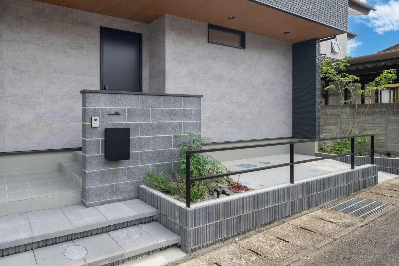 幅広の門柱には、エイジング加工が施されたブロックを使用。素材感を活かした表情に、門柱前の植栽が加わることで、ファサード全体を華やかに演出します。