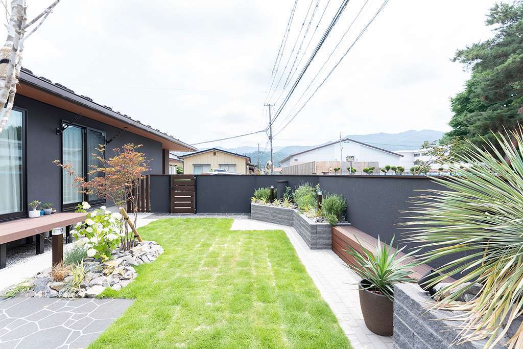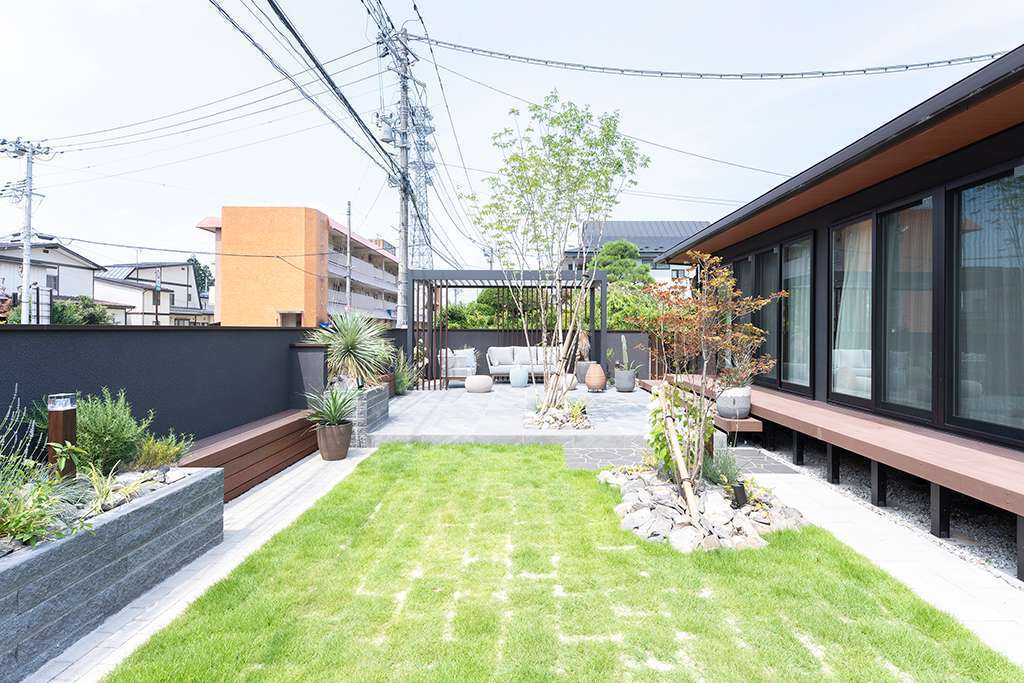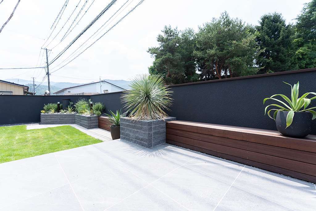 お庭の塀沿いにはウリン材のベンチを設け、落ち着いて過ごせる居場所を確保。ベンチに使用したウリンは耐久性、耐水性、耐腐朽性に優れた高品質な木材。他の木調製品との見た目の相性がよく、外構全体が調和した高級感ある仕上がりで、庭全体に統一感と心地よさを持たせました。