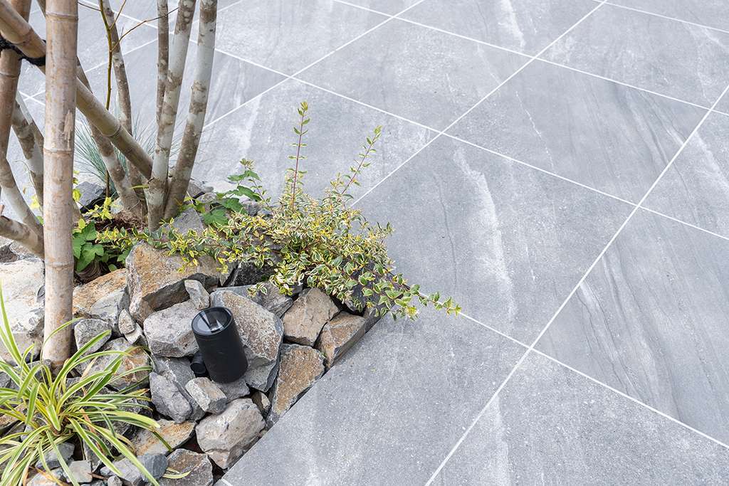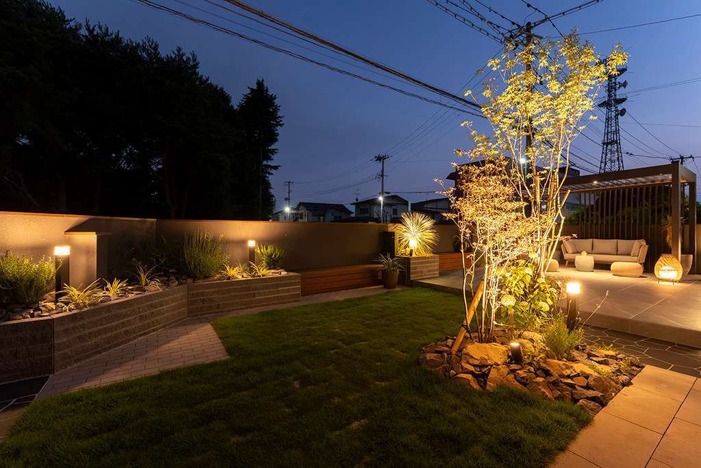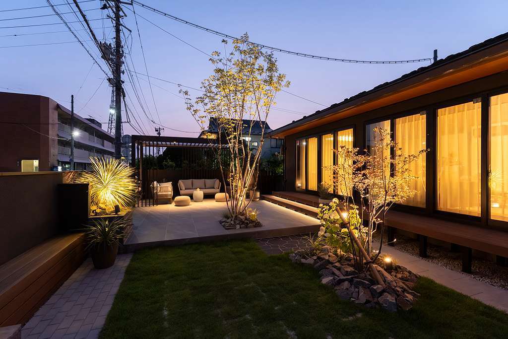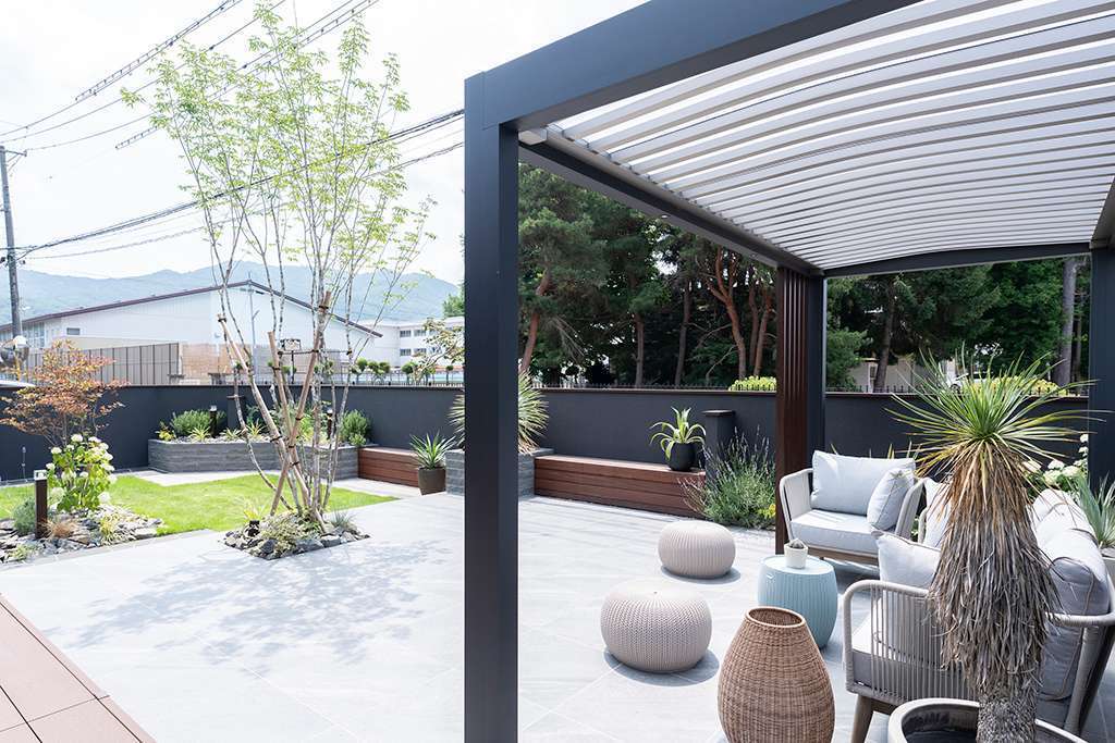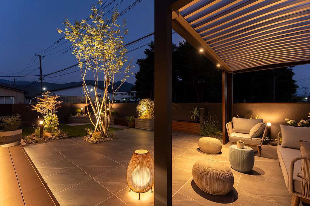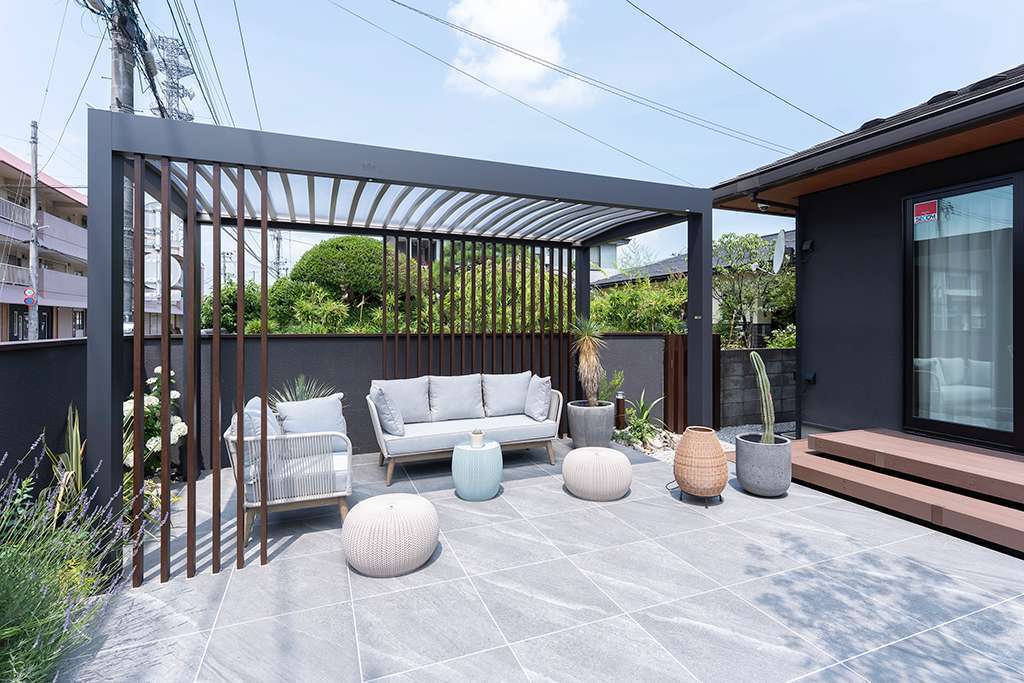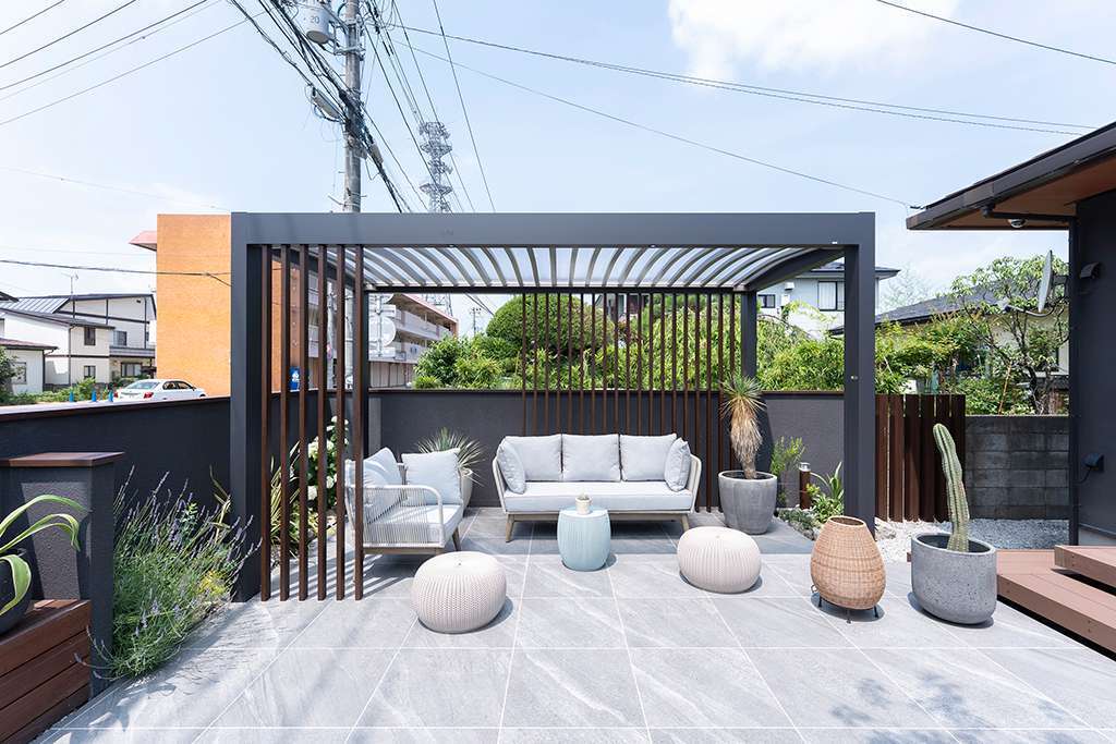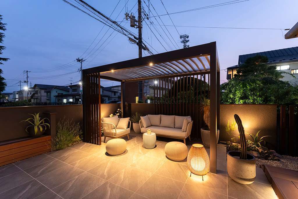 タイルデッキ上に設置したのはタカショーの「ホームヤードルーフ」。見た目の美しさだけでなく、屋根材にポリカーボネートを使用しているので、強い日差しを柔らかく抑え、雨や雪にも左右されない快適なお庭に。また、ルーフにはダウンライトを入れることで、夜間はタイルの陰影や植栽の立体感が際立つ仕上がりとしました。