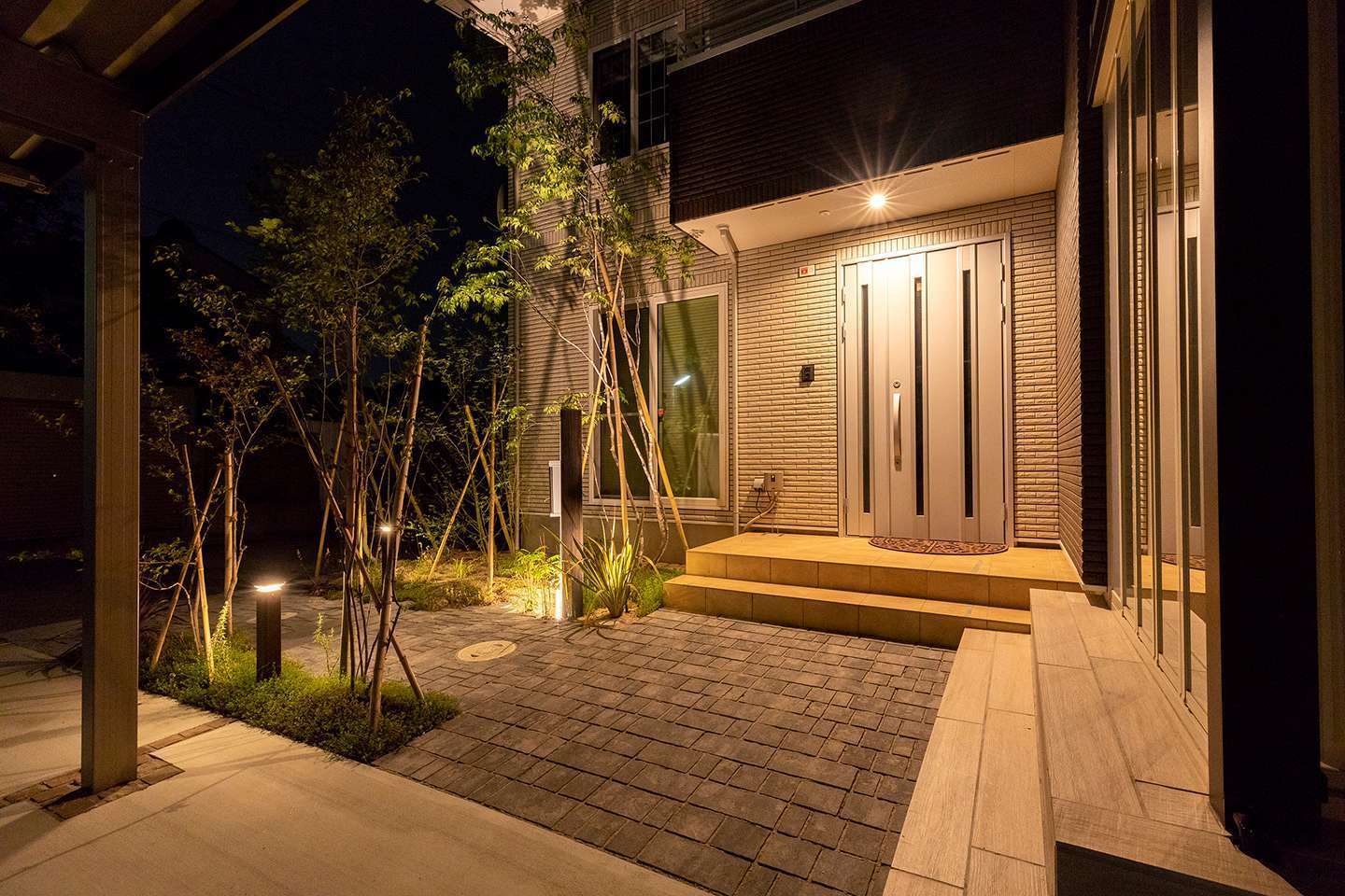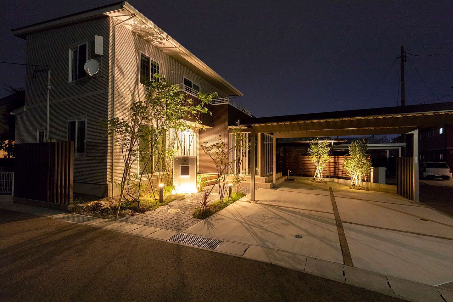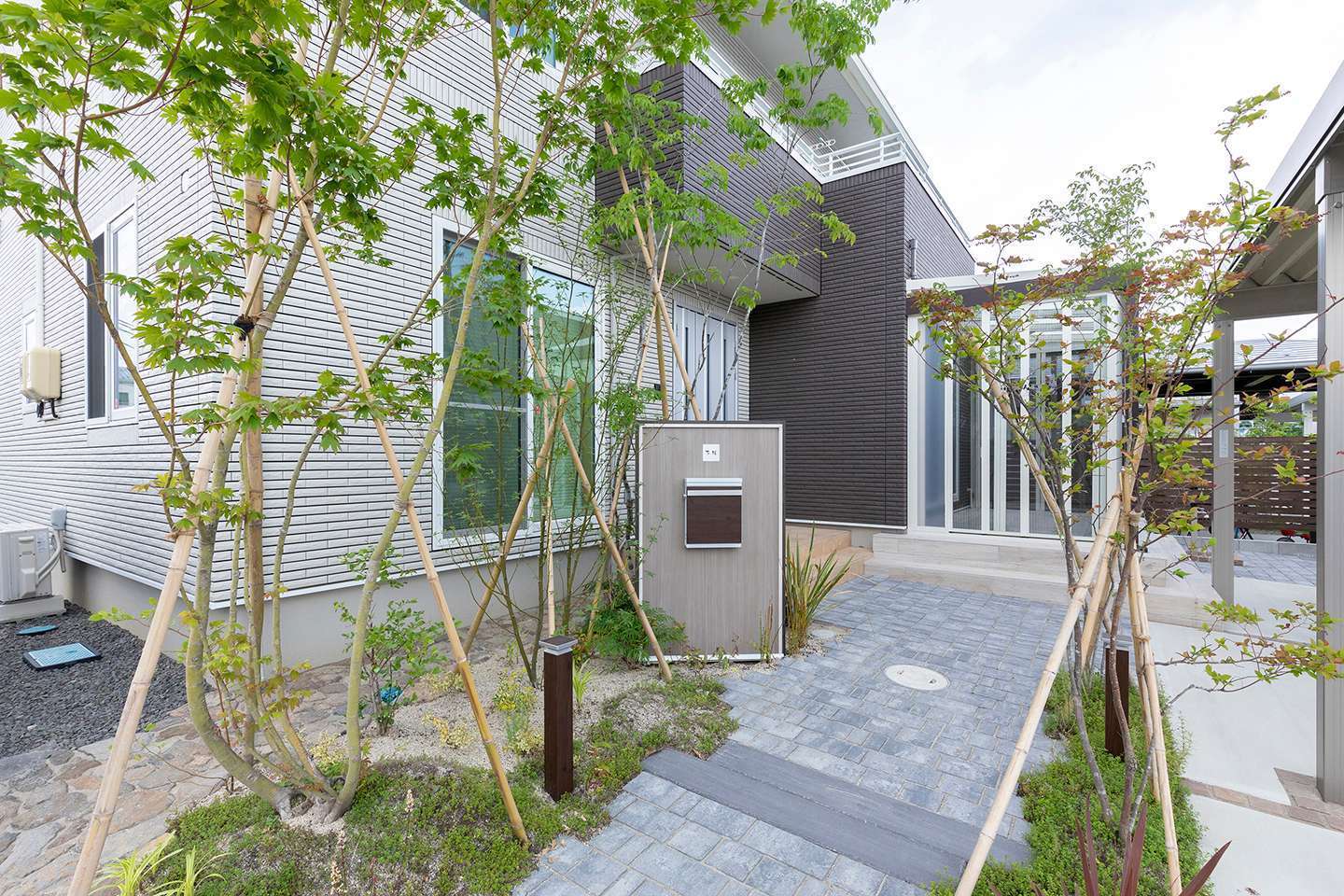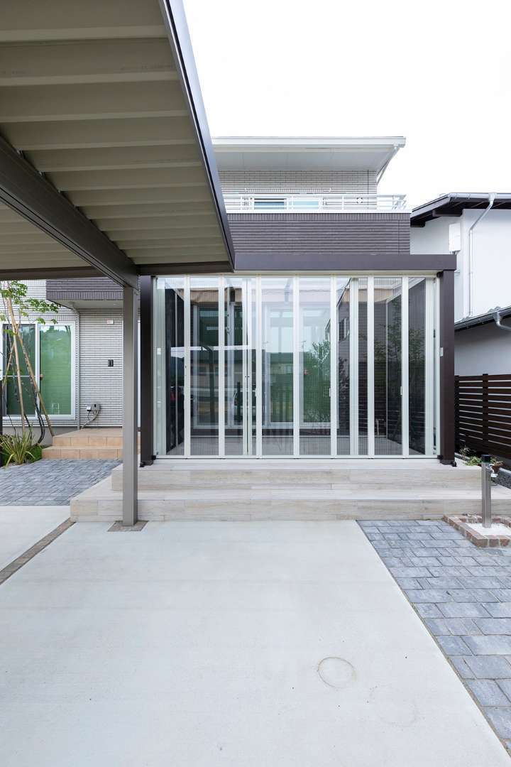 【ご要望】 玄関前の目隠しとカーポートをご要望でした。 【施工ポイント】 建物の水平ラインに合わせ、建物周りは直線を意識したデザインに。…