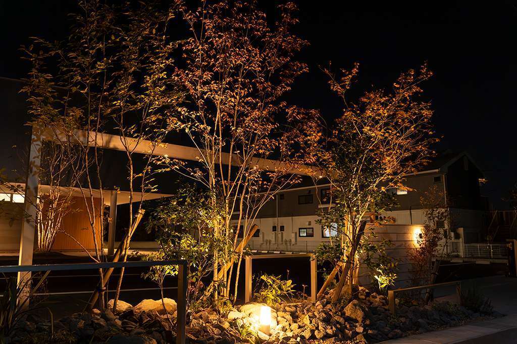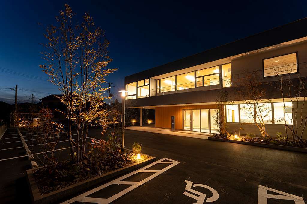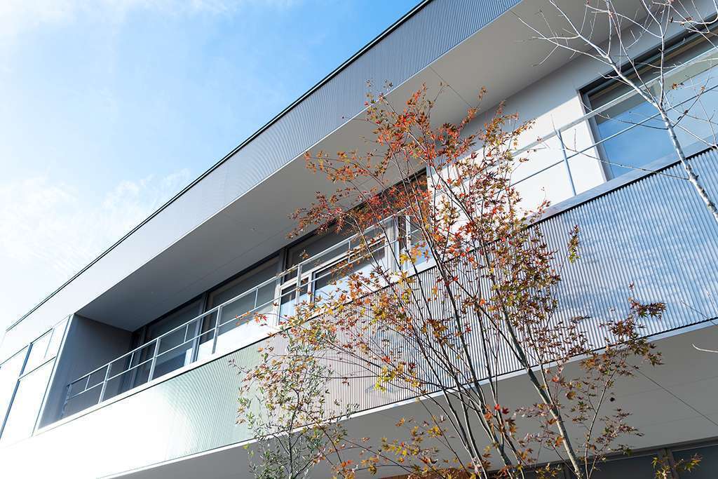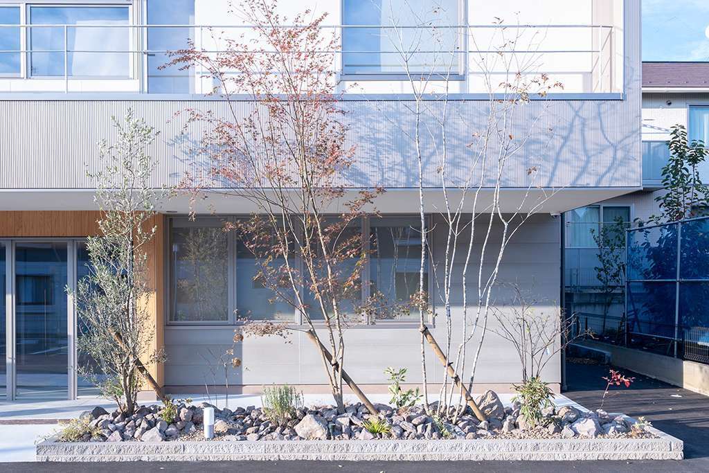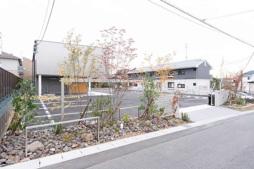 建物と外構のバランスを考え、緑が自然に馴染む植栽の配置や、空間の見え方まで含めて計画し、長く快適に使えるオフィス外構に仕上げました。