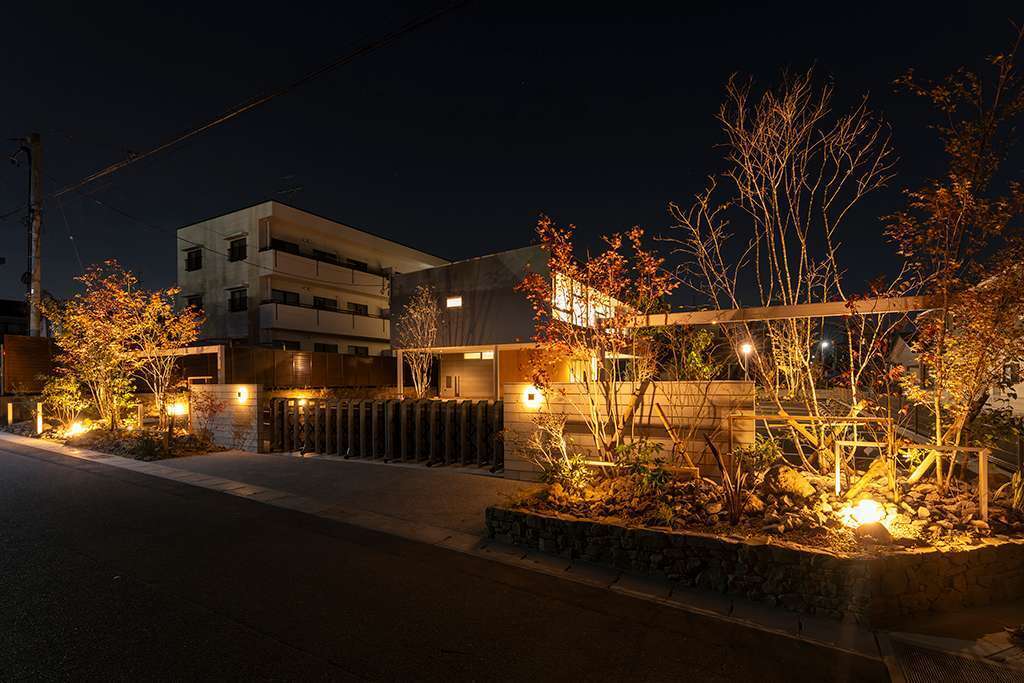 社屋新築に伴う外構工事(境界・門まわりの整備、カースペースの確保、植栽スペースの照明を含む計画)。