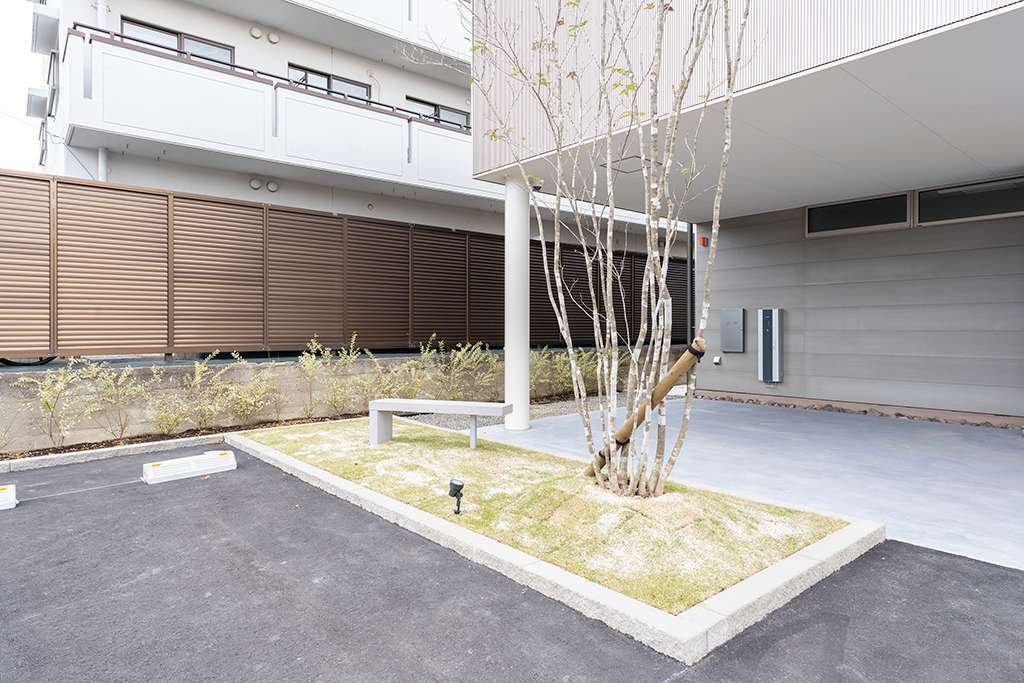 そこで働く人の過ごしやすさにも配慮し、建物2階からも植栽が楽しめるよう、配置や高さを考えた植栽計画としています。芝生とベンチを設けた休憩スペースは、業務の合間に気持ちを切り替えられる場として整えました。