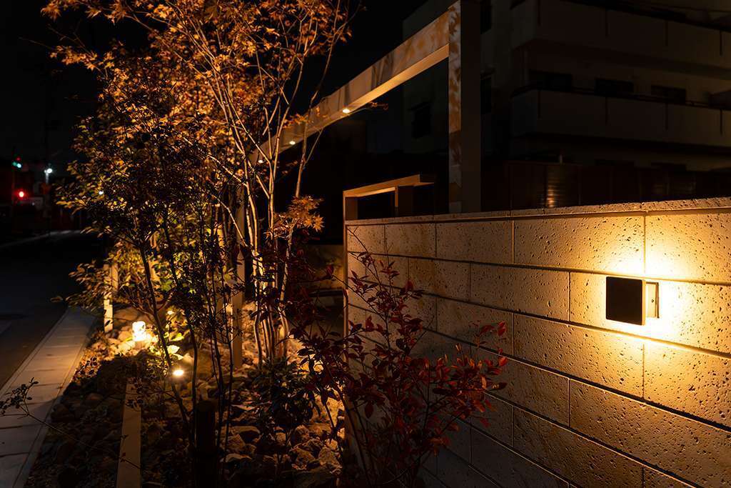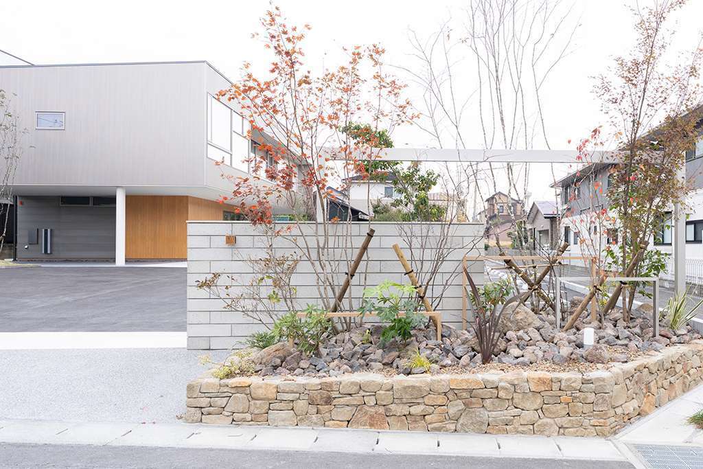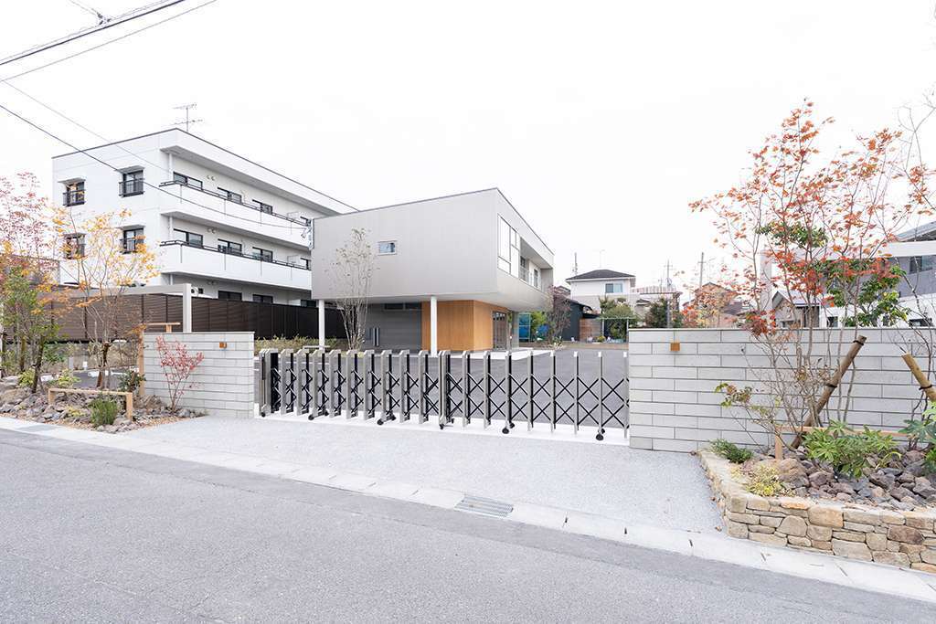 敷地の出入口には、建設会社という業態を踏まえ、大型車両の出入りにも配慮した伸縮ゲートを設置。門まわりは、大小さまざまなフレームと、大谷石ならではの質感を活かした落ち着きのある門袖で構成しました。